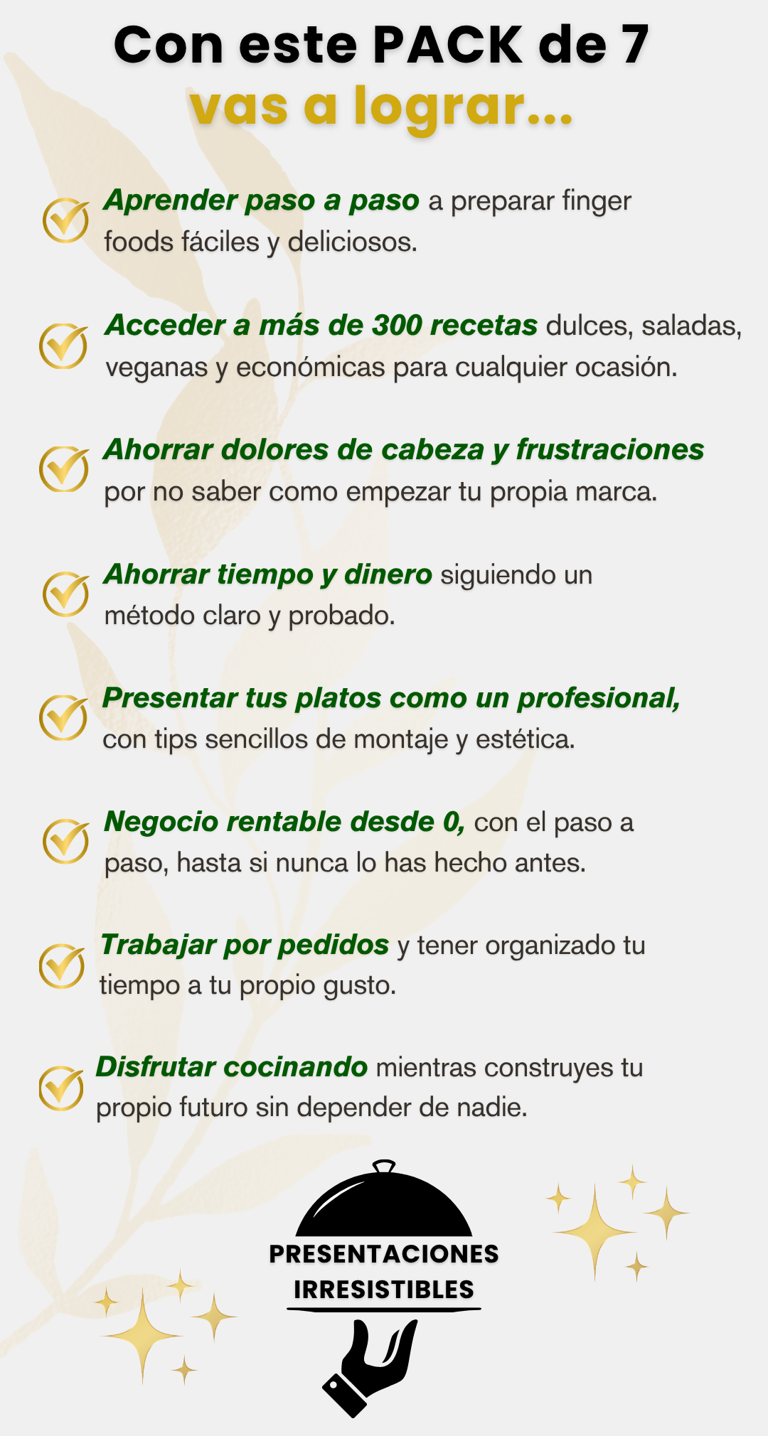 Es un combo digital con 7 ebooks al precio de 1. Incluye +300 recetas de finger foods, guías de costos y presentación, ideas de marketing, y pasos para empezar tu negocio desde cero. También podés usarlo para mejorar tus comidas familiares y sorprender a tus invitados.