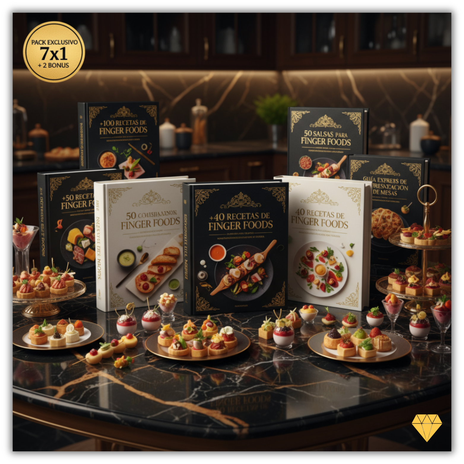 Es un combo digital con 7 ebooks al precio de 1. Incluye +300 recetas de finger foods, guías de costos y presentación, ideas de marketing, y pasos para empezar tu negocio desde cero. También podés usarlo para mejorar tus comidas familiares y sorprender a tus invitados.